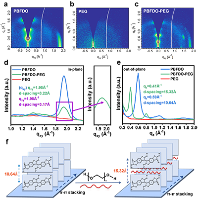 图3 PBFDO- PEG薄膜的掠入射广角X射线散射表征与薄膜的微观结构示意图。a) PBFDO薄膜,b) PEG薄膜,c) PBFDO-PEG共混薄膜的GIWAXS图案。 GIWAXS检测到的PEG混掺后d) (010)峰和e) (100) 峰位移。f) PBFDO薄膜与PBFDO-PEG薄膜的微观结构改变示意图。