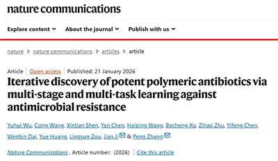 2026年1月21日,相关成果以“Iterative discovery of potent polymeric antibiotics via multi-stage and multi-task learning against antimicrobial resistance”为题发表在《Nature Communications》,吴宇晖、王聪、沈欣恬博士研究生为论文共同第一作者。