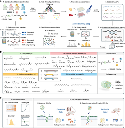 为此,浙江大学高分子科学与工程学系计剑教授、张鹏研究员团队开发了一套AI指导的工作流(PolyCLOVER),用于功能高分子材料的智能设计。PolyCLOVER结合了多阶段自监督学习、主动学习和高通量实验,能高效地在广阔的高分子化学空间中导航,迭代式地推动功能材料的自主进化。将其应用于约10万量级的聚(β氨基酯)高分子化学库,研究团队仅用20天就发现了多种具有自组装能力的强效高分子抗生素。体外和体内实验表明,这些高分子抗生素不仅可以用于单独治疗,还可用作抗生素载体,恢复细菌对青霉素的敏感性。结果表明,PolyCLOVER是一个强大的框架,能够有效应对冷启动问题,在无需依赖外部标注数据的前提下,实现对新型功能高分子材料的高效发现。