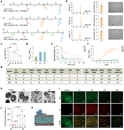 图4 | 体外表征结果。a, H1–3结构。b,自组装性能。c,杀菌性能。d,稳定性。e,杀菌动力学。f,耐药性变化。g,对抗临床分离的多重耐药菌结果。h-i, 机理研究。