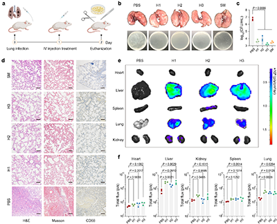 研究团队进一步在小鼠肺部感染模型中评估了SANPs的体内治疗效果(图5)。结果显示,H1–3可显著降低肺部细菌负载、修复组织损伤,并有效缓解炎症反应,整体疗效与传统抗生素相当。