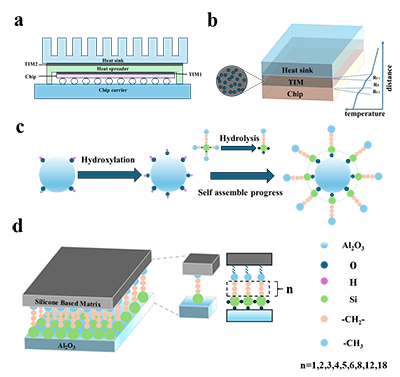 图1. TIM 结构、电阻分解与 自组装单分子层(SAM)修饰策略。(a)球栅阵列(BGA)封装示意图:芯片与散热片、散热器之间部署两层 TIM,用于填充空隙、高效导热带走热量。(b) 为热阻分解示意图:有效热阻(REFF)由体热阻(RB=BLT/κTIM)和两个界面的接触热阻(RC1、RC2)组成,高填料加载降低RB 但易升高RC。(c) 为 SAM 修饰 Al2O3的两步制备流程:先通过食人鱼溶液羟基化处理 Al2O3,再在甲苯中与硅烷自组装形成SAMs修饰填料(S-Al2O3)。(d) 为链长调控 SAMs 的作用示意图:通过改变烷基链长(n=1,2,…,18)调节填料表面能与聚合物相容性,优化分散性、缩减粘结层厚度、降低REFF。