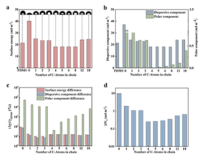 图2. SAM 链长调控表面能与分散性。(a) 为接触角与表面能变化曲线:未修饰 Al2O3(C0)表面能最高,C4 链长时表面能降至最低(18.17 mJ m-2),与硅酮基体表面能匹配最佳。(b) 为表面能的分散组分(