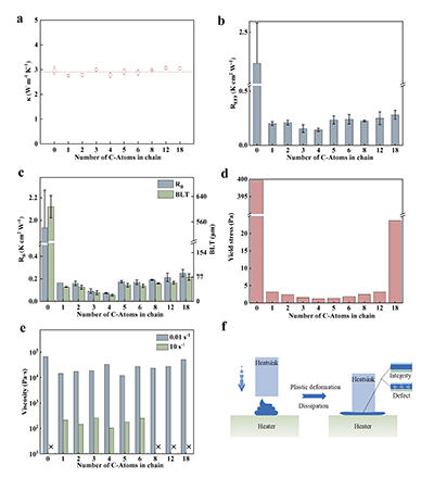 本次工作系统构建了从C1到C18的自组装单分子层(SAMs)“链长库”,将其接枝到氧化铝(Al2O3)填料表面,在相同装配压力下对比了表面能、分散性、流变行为、键合层厚度(BLT)与有效热阻REFF 的耦合关系,得到三点关键结论:1. 存在清晰的最优链长窗口,C4 实现最佳“表面能匹配”:表面能分析显示,C4 条件下填料与硅基体系达到更优匹配,可显著抑制再团聚,提升体系宏观均匀性。2. “压薄”是降低热阻的关键几何杠杆:在相同压力下,C4 使材料更易发生剪切变稀与塑性形变,键合层厚度 BLT 可由未改性样品的约 608 μm 降至约 20 μm,从而显著降低体相贡献热阻。3. 界面“更软、更黏”,接触热阻同步下降:原子力显微镜测量表明,C4 形成一种“分子弹簧”式界面特征,兼具较低界面模量与更强黏附,有助于提升真实接触面积并抑制接触热阻。综合作用下,C4体系由于最佳表面能匹配实现超低有效热阻REFF=0.142K·cm2 W-1,并形成可推广的“分子到宏观”设计规则。该成果是团队2024年发表工作的延续(Adv. Funct. Mater. 2024, 34, 2402276)。2024年研究已证明:利用SAMs进行界面工程,可在高填充TIM中同时降低体相热阻与接触热阻。2026年工作进一步回答“为什么会出现最优点、如何稳定复现”,通过系统链长筛选将经验优化提升为可复用的设计准则。