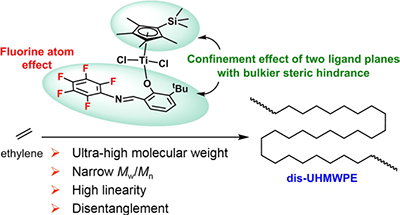 近日,中国科学院长春应用化学研究所王保力研究员团队报道了一系列半夹心型钛配合物的合成,并将其用于制备超高分子量聚乙烯,所得聚乙烯同时具有超高分子量(316万至715万)、窄分布(Mw/Mn < 2.6)、低支化(<0.5/1000 C)和解缠结的特点(图1)。催化剂配体的双平面及氟原子(图1和图2)在控制聚乙烯的分子量和解缠结度方面发挥着重要作用。冷压成型和差示扫描量热(DSC)退火实验证明了分子链的解缠结状态。作者利用电子顺磁共振(EPR)和原位 1 H NMR 实验提出了合理的活性种及反应机理。