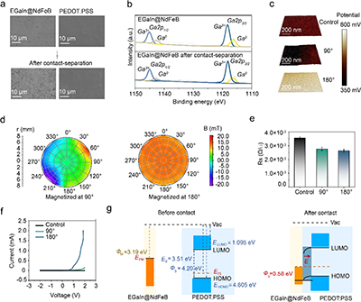 EGaIn@NdFeB/PEDOT:PSS接触的电流-电压(I-V)曲线表现出典型的二极管整流特性,表明界面处存在肖特基势垒。接触时,两层薄膜之间的EF差异驱动了从EGaIn@NdFeB指向PEDOT:PSS的内建电场的产生,导致PEDOT:PSS能带向下弯曲,建立肖特基势垒(ΦB)。在接触-分离过程中,界面处的机械刺激激发了空间电荷区中的非平衡电子-空穴对,进一步被内建电场分离,产生一个电势差(|qΔV|),驱动外部电路的直流电流。当EGaIn@NdFeB薄膜以180°方向磁化后,EGaIn@NdFeB/PEDOT:PSS界面处的肖特基势垒高度最低,从而促进了界面间更高效的载流子传输,电荷转移效率、电流输出和响应速度。当用BaFe12O19代替NdFeB颗粒时,得到了类似的效果,验证了磁电效应增强的摩擦伏特效应的普遍性。