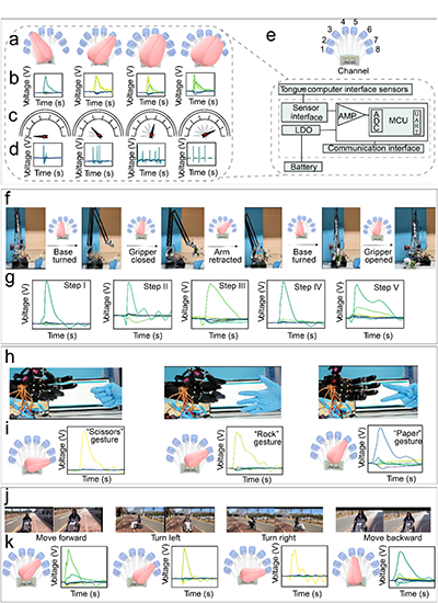 灵活、交互式的舌控界面由三个核心组件构成:1)一个1×8触觉传感器阵列,利用磁电效应增强的摩擦伏特效应,并采用人体工程学设计以适应舌头运动,从而实现静音、抗疲劳的通信;2)一个8通道采集芯片,包括信号处理和无线通信模块,全部集成在柔性印刷电路板(PCB)上,可将实时传感信号无线传输至上位机和下位机控制驱动器;3)一个数字化设计的3D打印牙套,用于结合传感器阵列和PCB,确保舒适、操控方便并长期耐用(图1)。
