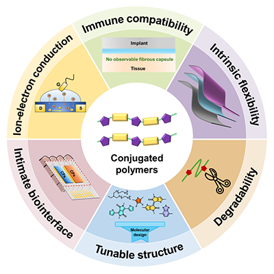 图1. 共轭聚合物是下一代生物电子学的功能核心。