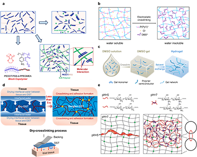 图3 基于导电聚合物复合材料的生物界面。a) 通过改性PEDOT:PSS调节机械性能。b) 可溶于水的导电聚合物通过对离子静电交联直接形成水凝胶结构。c) 不溶于水的导电聚合物通过溶剂交换形成水凝胶结构。d) 通过双面胶带(DST)实现水凝胶的组织粘附。e) 通过pH调控的拓扑链缠结介导粘附。