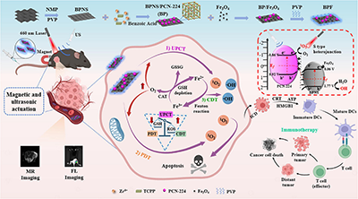 该BPF平台以超薄黑磷纳米片(BPNS)作为压电还原组分,金属有机框架PCN-224作为光敏氧化组分,二者形成S型异质结(S-scheme heterojunction);超顺磁性Fe3O4纳米粒子锚定于异质结表面,赋予体系过氧化物酶(POD)和过氧化氢酶(CAT)样活性。研究团队系统表征了BPF的结构、光电化学性质、压电性能和S型异质结的电荷转移机制,并在体外细胞模型、三维多细胞肿瘤球以及多种小鼠黑色素瘤模型(原位瘤、远端瘤、复发模型和肺转移模型)中全面评估了其治疗效果和免疫激活能力。