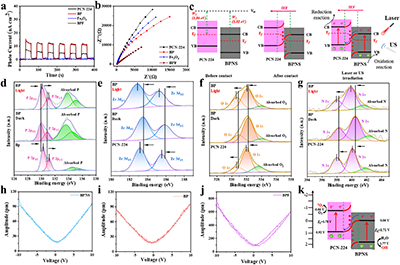 在光电流响应测试中,BPF经660 nm激光和超声联合激发后,S型异质结的内建电场有效促进光/声激发载流子的定向迁移,抑制电子-空穴复合,显著增强单线态氧和羟基自由基的产生。超声照射10分钟后,BPF的单线态氧生成效率约为BP的1.5倍、PCN-224的3倍。Fe3O4组分在酸性条件下通过Fenton反应催化H2O2生成羟基自由基,同时其CAT样活性分解H2O2产生O2以缓解乏氧,并有效消耗GSH削弱肿瘤的抗氧化防御。