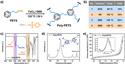 研究首先以OTs封端的乙二醇二对甲苯磺酸酯(PETS)为模型,探索了OTs基亲电试剂在Friedel-Crafts烷基化反应中的可行性。在FeCl3/DBB(1,4-二苯基丁烷)催化体系中,反应转化率可达80%,显著优于传统FeCl3/DCE或FeCl3/NB体系。结构表征证实了Poly-PETS的成功合成,但其BET比表面积仅为101 m2 g-1,远低于已报道刚性亚甲基桥联的HCPs,暗示柔性骨架在去除溶剂后难以维持永久孔道结构(图1)。