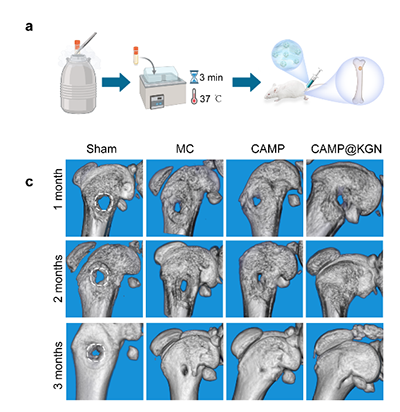 此外,CAMP 的冰晶重结晶抑制活性显著优于常规冷冻保护液,在大鼠股骨缺损修复实验中,冻存后的 CAMP 构建体植入体内3个月,MicroCT 结果清晰显示骨缺损得到有效修复,验证了其优异的体内再生效果。