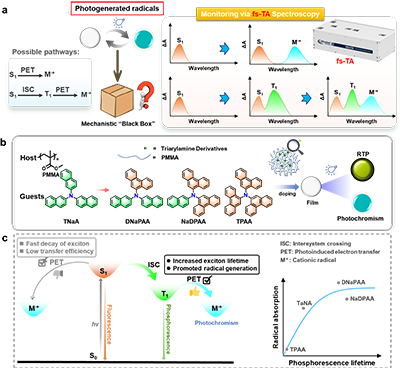 近年来,利用激发三重态实现室温磷光的有机发光材料取得了重要进展,为发展具有时间分辨特性的光响应体系提供了新思路。与此同时,部分有机分子在激发态下可发生光诱导电子转移,形成具有双重态特征的阳离子自由基,其吸收光谱与中性态相比变化显著,展现出优异的光致变色潜力。