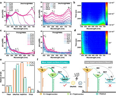 通过飞秒瞬态吸收光谱分析,研究团队进一步阐明了激发态演化的动力学过程。在DNaPAA@PMMA体系中,激发后依次出现单重态激子 (458 nm)、三重态激子 (543 nm) 和阳离子自由基 (735 nm) 的特征吸收峰,三者形成与衰减的时间序列清晰表明了“单重态→三重态→自由基”的演变路径。相比之下,TPAA分子在PMMA中三重态激子生成效率低、自由基信号微弱,未表现出明显的光致变色行为。