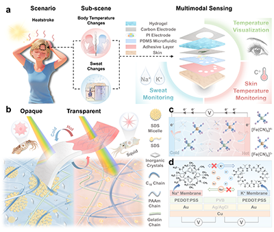 图1. 一体化热电凝胶贴片结构设计及多模态功能原理