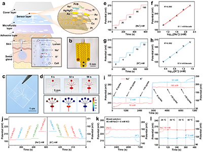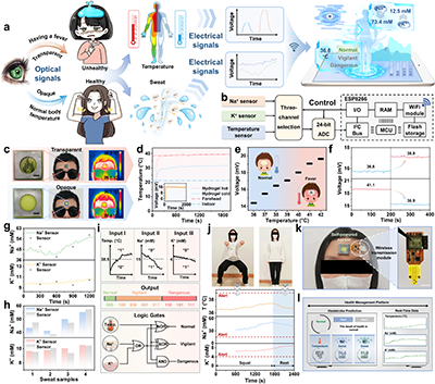 针对上述问题,太原理工大学集成电路学院张虎林教授团队在《ACS Sensors》发表重要研究成果,提出了一种集可视化反馈、自供能感知与多模态检测于一体的可穿戴水凝胶贴片。该贴片基于双功能热电化学水凝胶构建,在35-42 °C生理温度范围内实现快速(约40 s)热致变色响应,由不透明转变为透明,实现无需外部设备的直观温度预警。同时利用热电效应实现温度信号的自供能输出,其塞贝克系数达到1.86 mV K-1,能够将温度变化转化为稳定电信号。系统集成微流控电化学传感模块,可对汗液中的Na+和K+离子进行实时监测,表现出良好的选择性与稳定性。通过融合体温与电解质信息,该系统构建了多参数驱动的双阶段中暑风险评估机制,实现从早期预警到危险状态识别的动态监测。该贴片可贴附于人体皮肤,实现体温与汗液电解质的连续无创监测,在体温超过约38.5 °C时提供可视化预警,并支持无线数据传输,展现出在中暑预警和健康监测中的应用潜力。该研究为中暑主动预警及个性化健康管理提供了一种集成化解决方案,在户外作业安全、运动健康监测及智能医疗等领域具有良好的应用前景。该工作以“All-in-One Wearable Hydrogel Patch for Multimodal Visualized and Quantitative Heatstroke Monitoring”为题发表在《ACS Sensors》。太原理工大学博士生杨心茹为第一作者,张虎林教授和台湾大学林宗宏教授为通讯作者。研究获国家自然科学基金,山西省科技合作交流专项和山西省研究生科技创新项目支持。