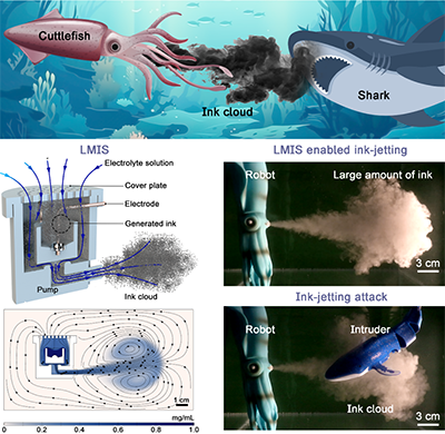 图1 自然界与人工制成的墨囊。上图反映的是神奇水生物乌贼喷墨逃生场景,下图为液态金属墨囊工作原理及水下仿生机器人实际喷墨情形。