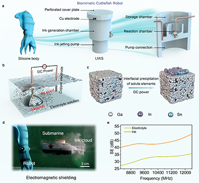 图3 仿生液态金属墨囊构成原理与设计方案。a. 仿生机器人分解图,突出显示了集成式墨囊组件;b. 直流电压触发生成墨水原理;c. 直流电压作用下从液态合金中加速析出金属溶质;d. 机器人对抗模拟入侵者的防御能力演示;e. 碱性溶液中产生的墨水对抗电磁干扰的屏蔽效果。