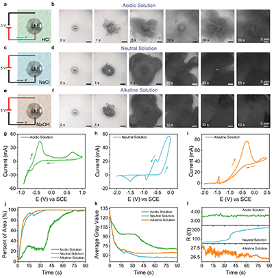 图4 液态金属在整个pH范围内的喷墨行为表征。a、c、e. 酸性、中性及碱性溶液中极化电压配置示意;b、d、f. 显示酸性、中性及碱性溶液中不同喷墨行为的光学图像;g-i. EGaInSn在酸性(g)、中性(h)和碱性(i)溶液中的循环伏安曲线;j-l. 不同溶液中喷墨过程随时间变化的墨水扩散面积(j)、平均灰度值(k)和电阻变化(l)的定量比较。
