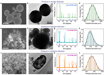 图5 不同溶液中液态金属喷墨产物的表征。a-d. 酸性溶液中的产物(阳极机理):经SEM(a)、TEM(b)和XRD(c)证实的球形In3Sn纳米颗粒及其粒径分布较宽(d);e-h. 中性溶液中产物(阴极机理):经SEM(e)、TEM(f)和XRD(g)证实为不规则的富锡簇,粒径分布更细(h);i-l. 碱性溶液中产物(阴极机理):经SEM(i)、TEM(j)和XRD(k)证实为类似的富锡簇,但与中性条件相比,粒径分布略宽(l)。