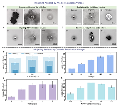 图6 不同极化电压作用下影响液态金属喷墨行为的因素。a-d. 阳极喷墨机理验证:(a) 酸浓度对氧化物介导的阳极喷墨的影响;(b) 碱性溶液中交流驱动下的EGaIn喷墨;(c) 酸性溶液中EGaIn的阳极喷墨;(d) 纯镓未发生喷墨现象。e-h. 阴极喷墨(碱性溶液)参数优化:Sn含量和液态金属体积(e)、极化持续时间(f)、电压幅值(g)以及电解质浓度(h)对生成墨水质量的影响。