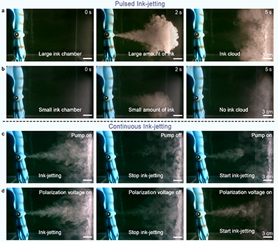 图8 配置有液态金属墨囊的仿生乌贼机器人在两种不同工作模式下的性能演示。a-b. 脉冲喷墨模式:演示机器人从大腔室(a)和小腔室(b)喷射墨水;c-d. 连续喷墨模式:展示机器人分别由喷射泵(c)和极化电压(d)控制喷射墨水,凸显了泵控制的即时响应与电压控制延迟响应之间的对比情况。