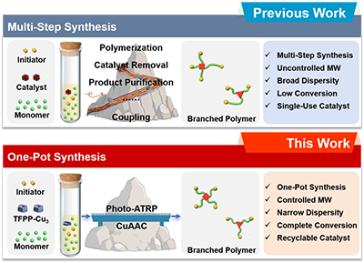 支化聚合物因其独特的分子构型与物理特性,以及丰富的末端官能团,在生物医学、能源、环境和先进材料等领域展现出广阔的应用前景。然而,传统可控合成方法通常需要两个独立反应过程:首先通过可逆失活自由基聚合制备聚合物链段,再利用点击化学等手段实现链段连接。这一过程涉及繁琐且耗时的中间纯化步骤以去除两步反应中的催化剂和杂质,严重限制了其工业应用。