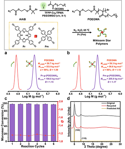 图2 通过photo-ATRP与CuAAC正交反应实现多臂星形聚合物的一锅法合成: (a,b) 多臂星形聚合物的GPC曲线;(c) 催化剂回收实验中不同批次聚合物单体转化率及分子量分布,和催化剂回收前后的衍射峰变化。