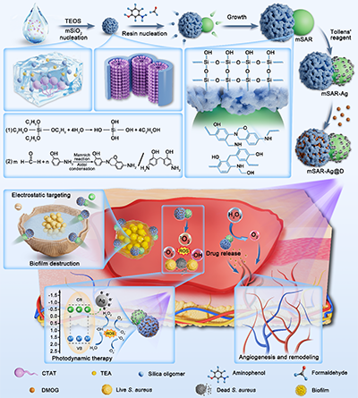 图1. 纳米机器人的合成与感染创面治疗机制示意图