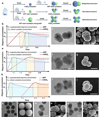 通过动力学控制调节两种前驱体的成核时间,可以得到具有单岛、双岛和多岛结构的纳米颗粒。CTAT可以作为结构导向剂,通过调节界面自由能生成Janus结构,也可以作为在SiO2侧生成介孔结构的软模板。通过调节CTAT的浓度,可以精确地调节Janus纳米颗粒的介孔大小。TEA作为碱性催化剂,可以调节TEOS的水解和聚合速率。此外,TEA的存在可以降低CTAT胶束的表面张力,增强其在溶液中的稳定性。