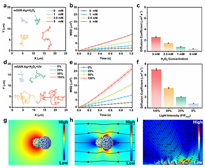 纳米机器人的运动性能受光和过氧化氢浓度的双重控制,表现出光/化学协同驱动。此外,纳米机器人团簇表现出光诱导的集体分散行为。在紫外光照射下,纳米机器人彼此远离,最终导致聚集体完全分散,证实了酚醛树脂的光催化活性对纳米机器人运动性能的关键作用。
