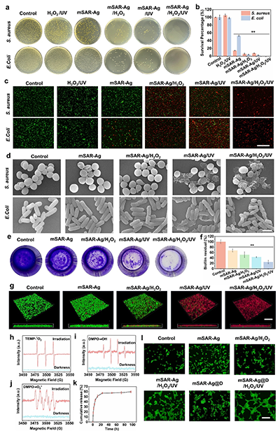 纳米机器人的抗菌、生物膜机制主要分为三点:1)光催化生成ROS消除细菌。2)负载的Ag纳米粒子不仅增强光催化性能,也表现出内在的抗菌活性。3)纳米机器人在光和过氧化氢的作用下推进,增加了纳米机器人与细菌的接触,从而提高抗菌效果。这些机制的协同作用导致了优越的抗菌性能。