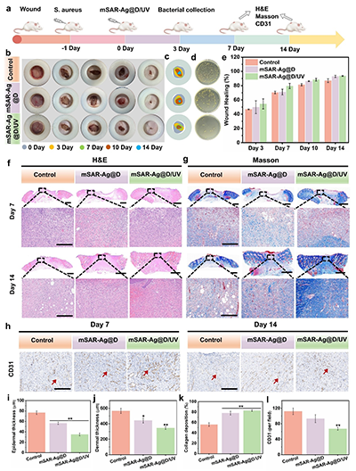 纳米机器人在金黄色葡萄球菌感染模型中表现出了优异的抗菌性能,可以加速伤口愈合,减少炎症,增强胶原沉积,促进新生血管和重塑。