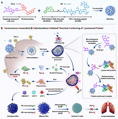 研究者设计了一种基于化学锚定策略的免疫治疗药物DN-Ghcy,用于克服药物外排泵以及免疫抑制型SASP介导的衰老肿瘤耐药 (图1)。DN是由PD-L1结合肽(DT300)和IDO抑制剂(NLG919)通过活性氧可断裂的连接子偶联形成的两亲性分子,Ghcy则是β-D-半乳糖基修饰的醌甲基前体与硫代半菁偶联形成的两亲性光敏剂,两者通过两亲性共组装形成组装体DN-Ghcy。