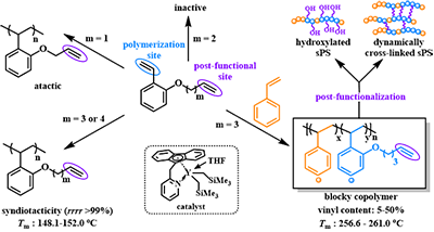 近日,中国科学院长春应用化学研究所王保力研究员团队报道了一类新型结晶性sPS衍生物的合成,分子链上乙烯基侧基的含量可以调节(0-100 mol%),并且在乙烯基含量高达50 mol%时,sPS衍生物仍然表现出高熔点(257.9 oC),保留了材料的结晶性。该sPS衍生物具有良好的后功能化能力,可通过点击化学反应制备其它功能性sPS,如与无机粒子具有良好相容性的含羟基的sPS、以及动态交联sPS。