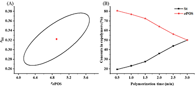 图3. (A) oPOS/St共聚反应竞聚率的95%联合置信区间. (B) oPOS-St共聚物中oPOS和St单元的含量与聚合时间的关系。