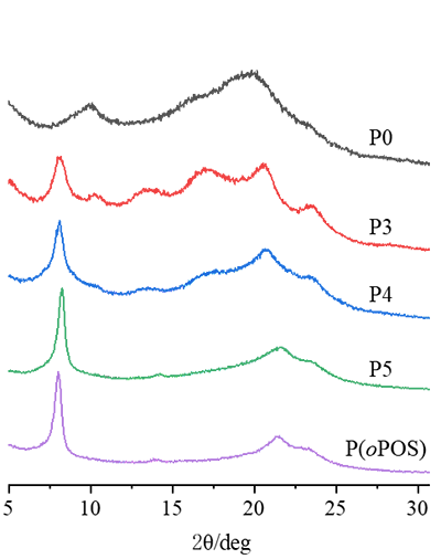 随后,作者研究了oPOS单体与苯乙烯的共聚。动力学实验表明,两者共聚形成了“类嵌段聚合物”。通过模拟共聚过程中材料组成演化,发现通过改变单体进料比能有效调节共聚物中oPOS含量(即乙烯基含量)、以及两种共聚单体的序列分布和组成梯度。结合WAXD,SAXS和DSC分析,作者认为这种“类嵌段结构”是乙烯基含量高达50 mol%的sPS共聚物仍然具有高熔点的关键因素,较长的间规苯乙烯链段有利于规整排列形成结晶区。