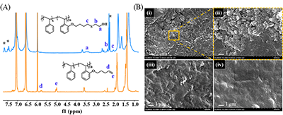 图5. (A) 羟基化反应前后聚合物核磁氢谱。(B) 不同羟基含量sPS与TiO2复合材料的SEM图像
