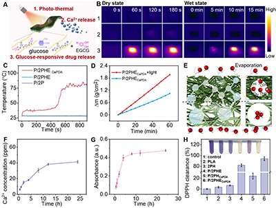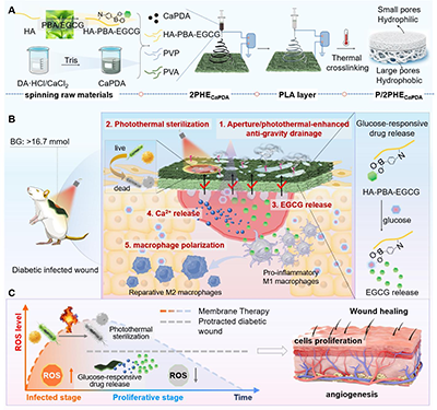 针对上述难题,东华大学陈志钢教授团队开发了一种可调控糖尿病创面微环境的多功能Janus结构纤维膜(P/2PHECaPDA)。该体系集成抗重力渗液管理、光热杀菌、钙离子释放、葡萄糖响应型药物递送四大功能。纤维膜由疏水聚乳酸(PLA)层与亲水复合层(2PHECaPDA)组成,后者为CaPDA及通过硼酸酯键接枝表没食子儿茶素没食子酸酯(EGCG)的透明质酸的复合层。这一多功能平台为感染性糖尿病创面的治疗提供了极具前景的新策略。