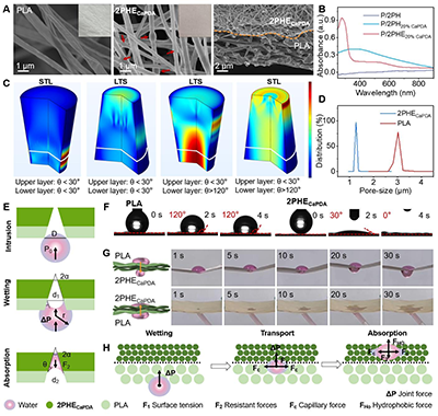 本研究通过盐酸多巴胺与氯化钙在缓冲液中自聚合24小时合成CaPDA NPs,并将透明质酸与PBA和表没食子儿茶素没食子酸酯(EGCG)通过硼酸酯键接枝得到HA-PBA-EGCG (HE),再通过分步静电纺丝构筑出疏水聚乳酸(PLA)层与亲水功能层(2PHECaPDA)组成 Janus 结构纤维膜 P/2PHECaPDA(图1.A)。研究表明,其微观形貌连续均匀、界面结合牢固,可依靠界面能梯度与拉普拉斯压差实现高效自泵式引流,速率高达 1.96 g?cm?2?h?1。(图1-2)