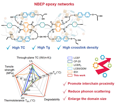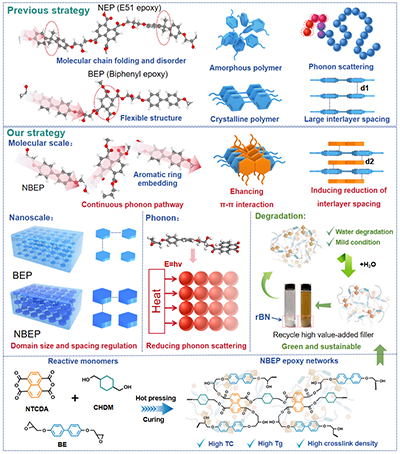 环氧树脂的低热导率限制了其在热管理领域的应用。在聚合物中引入液晶单元可提升其热导率。然而,交联体系中分子链运动能力受限,加之液晶单元间较弱的π-π相互作用以及较大的分子链层间距,导致严重的声子散射,难以实现热导率的显著提升(面外热导率<0.4 W·m-1·K-1)。为此,他们采用芳环诱导-趋近策略,将萘环键合到树脂交联网络中。该方法利用萘环与液晶之间的π-π相互作用,缩小分子链间的层间距,从而进一步提高热导率。萘环的引入还能减少沿分子链方向的声子散射。同时,引入动态酯键以改善降解性能。所制得的树脂具有高本征热导率(面内热导率1.05 W·m-1·K-1,面外热导率0.45 W·m-1·K-1)、高玻璃化转变温度(Tg > 220 °C)、优异的热稳定性(T5% = 342.7 °C)以及良好的水降解性能。分子动力学模拟证实,嵌入萘环可同时减小层间距并降低声子散射。该工作为开发兼具本征高热导率与可降解性的环氧树脂提供了一种新策略。