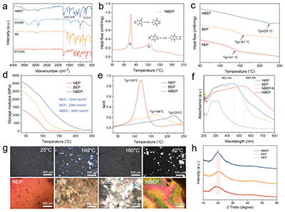 图2. (a) NTCDA、BE、CHDM 和 NBEP 的红外光谱图。(b) 用于合成 NBEP 的小分子单体混合物的 DSC 曲线。(c) NEP、BEP 和 NBEP 的 DSC 曲线。(d) NEP、BEP 和 NBEP 的 DMA 曲线和 (e) 损耗角正切曲线。(f) NEP、BEP、NBEP-N 和 NBEP 的固态紫外-可见光谱图及 (g) 偏光显微镜图像。(h) NEP、BEP 和 NBEP 的 XRD 谱图。
