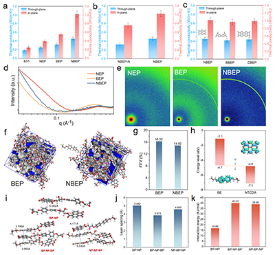 图3. (a) 不同样品的穿透平面热导率和面内热导率。(b) NBEP-N 和 NBEP 的热导率。(c) NBEP、BBEP 和 CBEP 的热导率。(d) 不同样品的小角X射线散射曲线。(e) 不同样品的二维小角X射线散射图像。(f-g) BEP 和 NBEP 的自由体积分数计算。(h) NTCDA 和 BE 的最高占据分子轨道-最低未占分子轨道计算。(i) 三种分子链构型的密度泛函理论计算。(j) 三种分子链构型的层间距数据及 (k) 相互作用能。