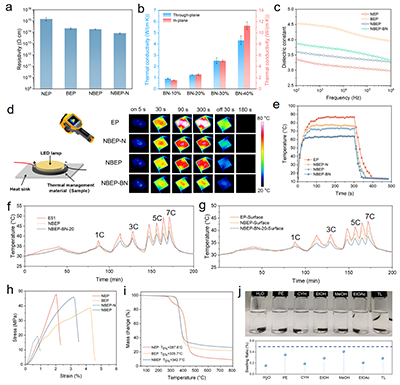 图4. (a) 不同树脂的电导率。(b) 不同填料含量下 NBEP 的热导率。(c) NEP、BEP、NBEP 和 NBEP-BN 的介电常数。(d) E51、NBEP-N、NBEP 和 NBEP-BN 的器件散热示意图及红外热成像图。(e) 各样品的温度统计曲线。(f) 软包电池表面温度的统计数据。(g) 材料表面温度的统计数据。(h) 不同树脂样品的拉伸强度。(i) 不同树脂样品的热重分析曲线。(j) NBEP 在不同溶剂中的抗溶胀测试。