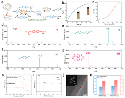 图5. (a) NBEP降解示意图。(b) NBEP的降解动力学曲线。(c) NBEP的降解热力学曲线。(d-g) 降解产物的液相色谱-质谱分析。(h) BN和rBN的红外光谱图。(i) BN和rBN的XRD谱图。(j) rBN的透射电镜图像。(k) NBEP-BN和NBEP-rBN的热导率。