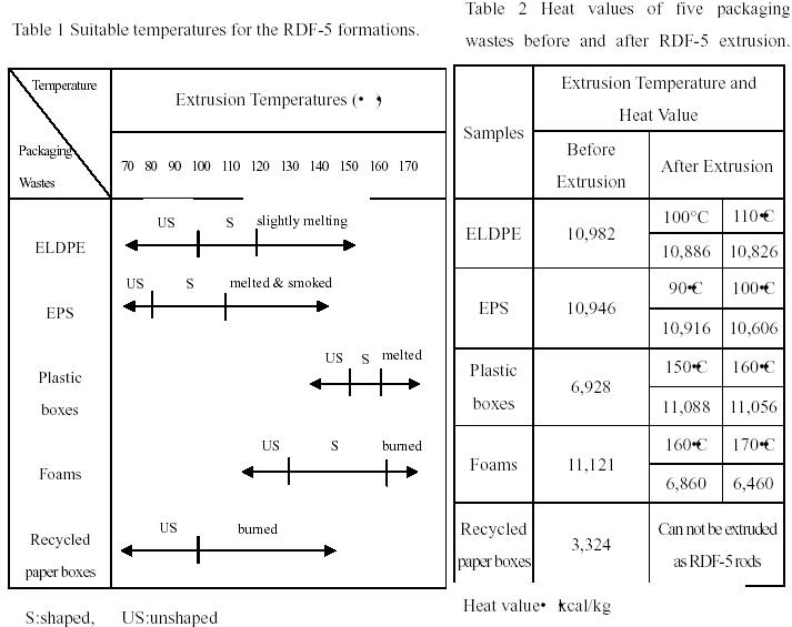 A preliminary approach was made in the paper to study the feasibility of RDF-5 made of packaging wastes. Five representative packaging wastes, including extended polyethylene (ELDPE) extended polystyrene (EPS), plastic boxes, recycled paper boxes, and foams were collected from Tainan science-based industrial park, Taiwan. The experimental procedures were shown in Figure 1. Proximate analysis shows that there are low water and ash content (<1%), high volatiled components and fixed carbon (>99%) in the packaging wastes except recycled paper boxes. In the heat value measurements, recycled paper boxes has 3,300 kcal/kg, the others are ranged from 6,900~11,000 kcal/kg. Except recycled paper boxes, carbon and hydrogen are the major components in other four packaging wastes. Elemental analysis also reveals that all five packaging wastes doesn’t contain sulfur. Thus, it may be deduced that most of the by-products would be H2O and CO2 if RDF-5 can be burned completely [1]. However, foams had higher nitrogen content (7.52%), it may cause NOx pollution after burning of RDF-5 [1,2]. Five metals (Zn, Cu, Cd, Pb, Cr ) were measured in TCLP testing. It shows that leaching concentrations of five metals in the packing wastes are all under the standards [3].Five packaging wastes were then broken into small pieces and extruded into RDF-5 rods under fixed pressure of 150kg/cm2 and different temperatures (table 1). Examples of shaped RDF-5 are shown as Figure 2. Recycled paper boxes can not be extruded into RDF-5. Heat value comparisons were then made between RDF-5 and raw materials(table 2). It was found that RDF-5 would carbonized at high temperatures and high pressure and resulted in slightly loss of the volatile heat value [2]. However, this finding doesn’t affect the high potential of these five packaging wastes to make RDF-5. Keywords: packaging waste, RDF, resource recovery, renewable energy.