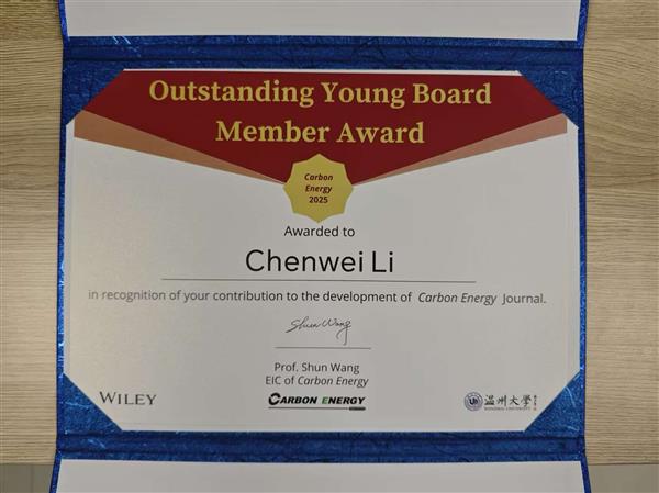 2025年度Carbon Energy优秀青年编委奖于2025 碳能源与创新技术国际学术研讨会上颁发,Wiley出版集团合作总监张大平与Carbon Energy执行编辑金辉乐,为西北大学孙涛、郑州大学尚会姗、温州大学肖遥、山东第一医科大学李晨蔚、郑州大学王鑫、温州大学吕晶晶 6 位青年学者颁奖,以表彰他们在2025年度对期刊的卓越贡献。