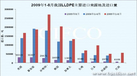 图十六 2009年1-8月我国LLDPE主要进口来源地及进口量