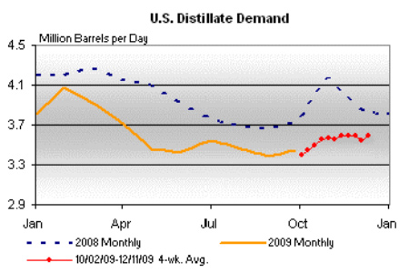 美国能源信息署的数据显示,上周美国原油和馏分油库存下降,汽油库存增长。美国原油库存量3.324亿桶,比前一周下降370万桶;美国汽油库存总量2.172亿桶,比前一周增长90万桶;馏分油库存量为1.644亿桶,比前一周下降290万桶。尽管原油库存比去年同期高2.9%;汽油库存比去年同期高5%;馏份油库存比去年同期高18.2%,但是原油库存、馏分油库存分别下降370万桶、290万桶,远远大于汽油库存增加90万桶。所以库存开始减少,主要原因是馏分油消费增加近500万桶,天气变寒冷使取暖油消费增加。未来一周美国东部的气温低于往前平均气温可能成为提振油价的因素。而馏分油的消费量比上周增加472万桶,但比去年同期减少298万桶。参见下图。